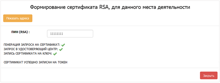 Если все действия выполнены верно, RSA-ключ сформируется и запишется на аппаратный криптоключ, о чем появится соответствующее сообщение.