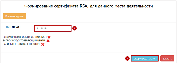 Откроется окно формирования сертификата RSA, введите ПИН-код пользователя аппаратного криптоключа части PKI, по умолчанию пароль: 11111111 (8 единиц) и нажмите «Сформировать ключ».