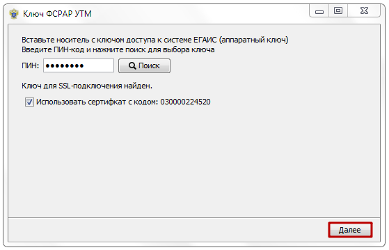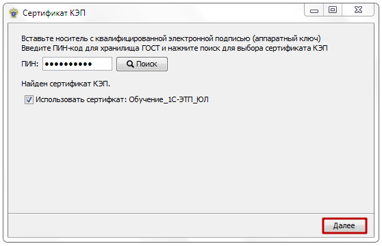 На следующем шаге введите ПИН-код пользователя аппаратного криптоключа части ГОСТ, по умолчанию пароль: 0987654321 и нажмите «Поиск». Выберите найденный сертификат и нажмите «Далее».
