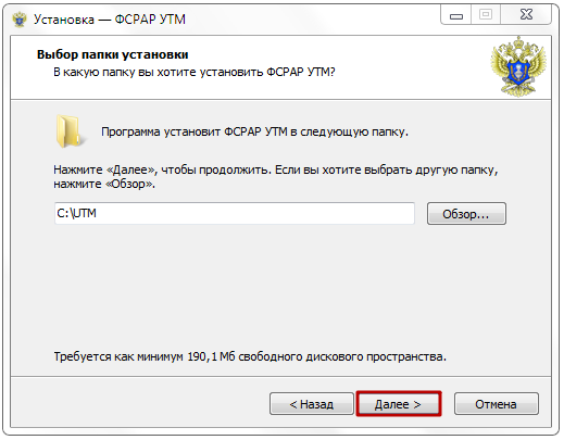 Выберите папку для установки, по умолчанию УТМ будет установлен на диск «С» в папку «UTM». Нажмите «Далее».