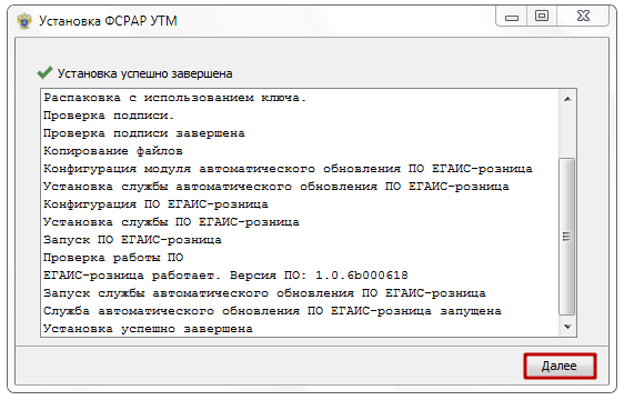 Начнется установка компонентов УТМ, дождитесь надписи «Установка успешно завершена» и нажмите кнопку «Далее».
