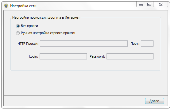 Выберите найденный сертификат и нажмите «Далее». Откроется окно настройки прокси для доступа в Интернет. Укажите настройки сервиса прокси или оставьте отметку «Без прокси», если не используете его.