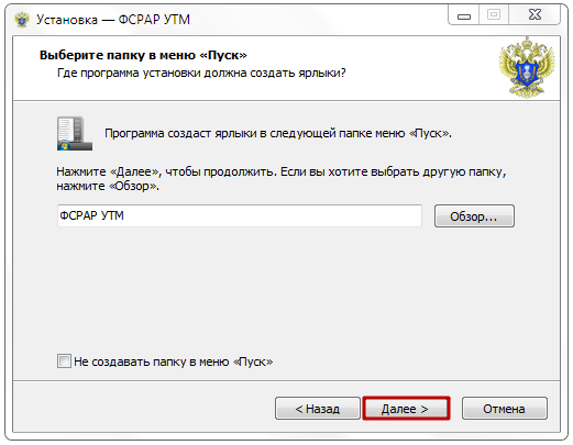 Выберите папку в меню «Пуск», для создания ярлыков программы, для перехода к следующему шагу нажмите «Далее».