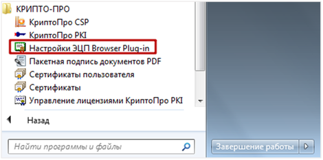 После перезагрузки компьютера откройте «Пуск» → «Все программы» → папка «КРИПТО-ПРО» → «Настройки ЭЦП Browser Plug-in».