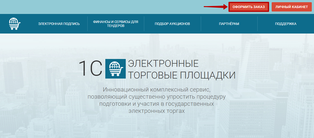 Если Вы еще не являетесь клиентом фирмы 1С, то Вам необходимо оставить предварительный запрос на получение электронной подписи на сайте 1c-etp.ru. Для этого нажмите на кнопку «Оформить заказ» в правом верхнем углу сайта.