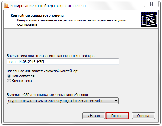 Введите имя для нового ключевого контейнера и нажмите кнопку «Готово».
