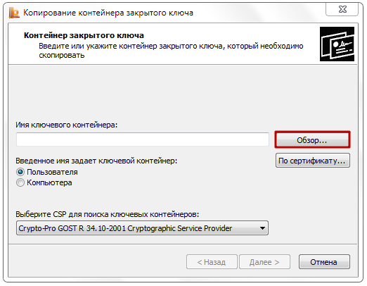 Через кнопку «Обзор» выберите необходимый для копирования ключевой контейнер и нажмите «ОК».