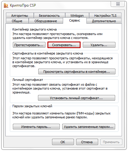 Как скопировать контейнер закрытого ключа с помощью КриптоПро CSP?