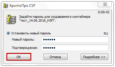 Откроется окно установки пароля на доступ к закрытому ключу. Введите и подтвердите пароль, нажмите кнопку «ОК».