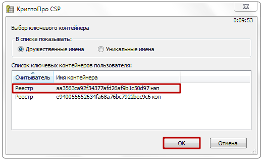 Вставьте и выберите носитель для хранения контейнера закрытого ключа и нажмите «ОК».
