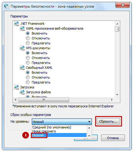 При помощи раскрывающегося списка сброса основных параметров, установите уровень безопасности «Низкий» и нажмите кнопку «Сбросить».