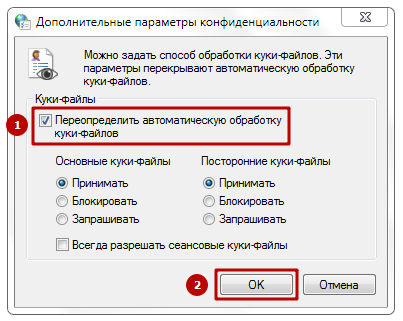 Затем нажмите на кнопку «Дополнительно», в открывшемся окне проставьте отметку «Переопределить автоматическую обработку куки-файлов», в разделах «Основные куки-файлы» и «Посторонние куки-файлы» отметьте «Принимать».