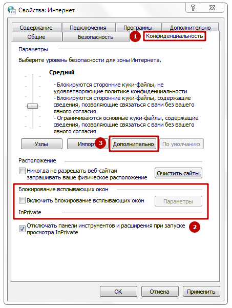 После проставления всех отметок нажмите кнопку «ОК» и перейдите на вкладку «Конфиденциальность». В параметре «Блокирование всплывающих окон» снимите отметку «Включить блокирование всплывающих окон».