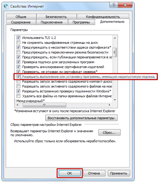 Перейдите на вкладку «Дополнительно» и проставьте отметку в параметре «Разрешать выполнение или установку программы, имеющую недопустимую подпись». Нажмите кнопку «ОК».